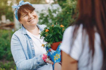 Gardening discovering, family and teaching concept. Happy mothe with little daughter are planting flowers into the ground
