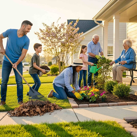 Front view of a diverse family planting flowers together in the garden on a sunny day