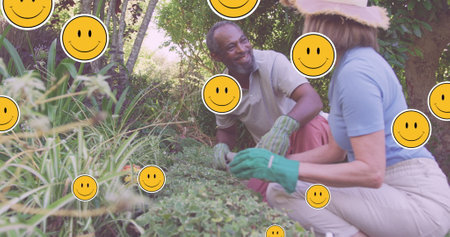 Image of emoji icons over diverse senior couple gardening. social media and communication interface concept digitally generated image.