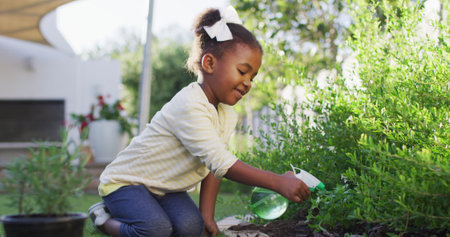 Happy african amercian girl gardening, watering plants in garden. staying at home in self isolation during quarantine lockdown.