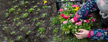 Springtime home gardening, hoeing soil and planting flowers. Taking care of new born plants and manual working in home garden.