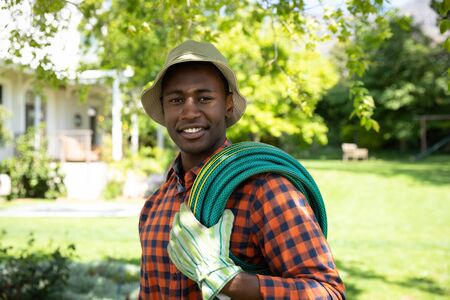 Portrait of an African American man in the garden wearing a hat and gardening gloves, carrying a hose and smiling to camera.