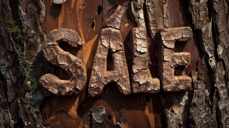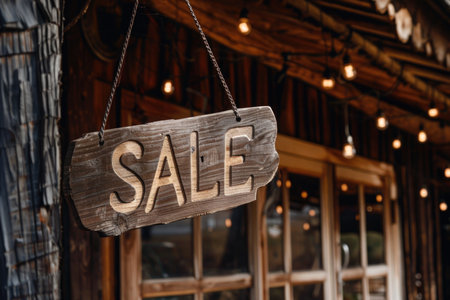 A weathered wooden sign with the word SALE carved into it hangs outside a rustic store with string lights and a wooden door.