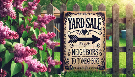 This photo features a handmade yard sale sign with an ornate border and a large arrow, set against a wooden fence. Blooming lilacs frame the sign, enhancing the bright and inviting scene with their vibrant colors.