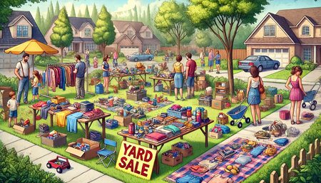 A vibrant yard sale scene features various items displayed on tables and blankets, including clothing, toys, and books. Shoppers browse the selection, while colorful banners and a cheerful yard sale sign add to the lively community atmosphere.