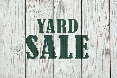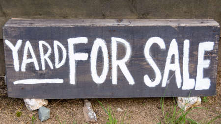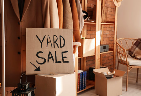 Cardboard with text YARD SALE and various unwanted things near brick wall in room