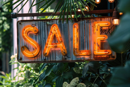 A rusty neon sign with glowing orange letters spelling SALE hangs in front of a lush green bush.