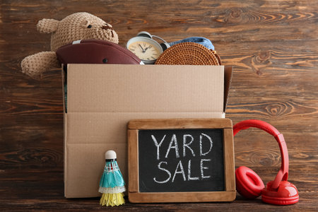 Essence of a local yard sale, showcasing a treasure trove of miscellaneous items packed in a cardboard box. Each object tells a story, promising unique finds for second-hand enthusiasts.