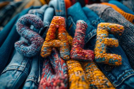 Knitted letters in multiple colors spelling out 'SALE', placed against denim and sweaters, providing a vibrant and eye-catching setup that's perfect for highlighting promotions and enticing shoppers.