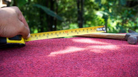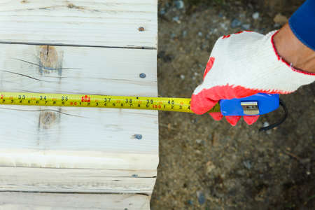 A man's hand holds a measuring tape and measures the length of the board. Measurement of the length of the building material.