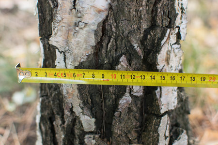 Female environmental engineer conducts field survey in pine forest, measuring, documenting tree diameter for carbon credit verification. Climate action, green forestry, ecological conservation efforts