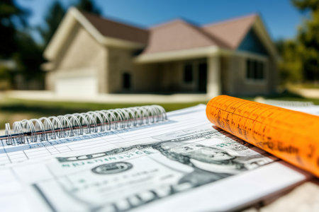 A financial planning notebook rests on a table with a checklist while a rolled-up measuring tape and a hundred-dollar bill add a touch of investment magic in front of a beautiful house.