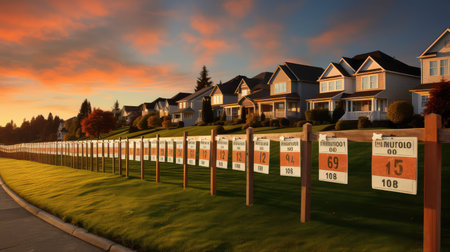 Aerial view captures the beauty of a suburban neighborhood in autumn, showcasing colorful trees, houses with varying roof colors, and cars driving on the streets