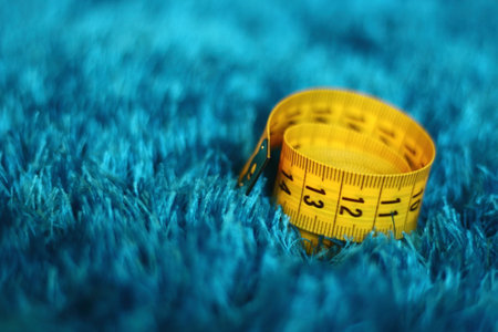 A close-up shot of a yellow measuring tape on a fluffy surface with a blurred background