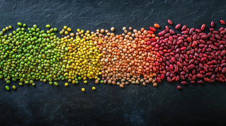 A vibrant display of bean varieties, from green mung beans to red kidney beans, arranged in a rainbow pattern on a dark slate background