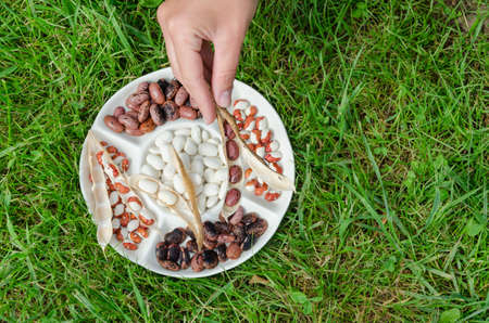 woman hand hold dried bean pod over the plate with colored beans on green meadow background