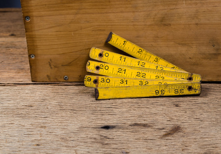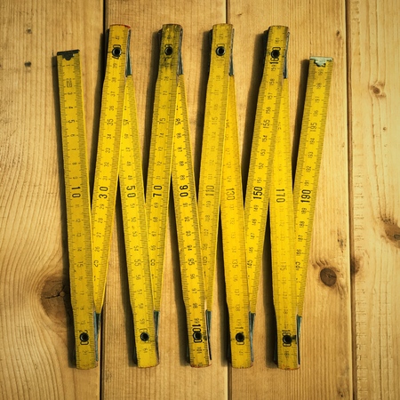 Close up of rulers from metric and imperial system on plywood room for copy yellow background