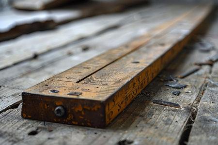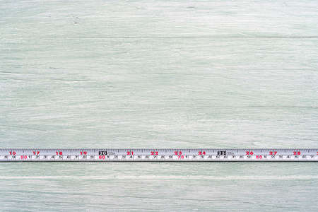 Old rusty ruler with black numbers on a working wooden table. vintage measuring tape. industrial background. carpentry workbench with copy space