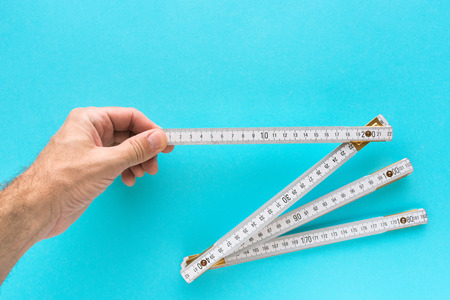 Hand holding folding ruler, overhead shot of carpenter using measuring tool over blue background