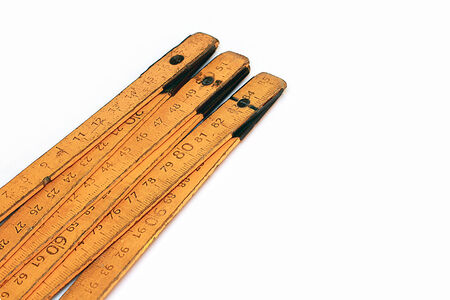 Close up of rulers from metric and imperial system on plywood room for copy white background.