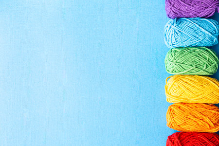 Knitting background with rainbow colorful yarn over blue, top view, flat lay with copy space