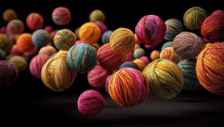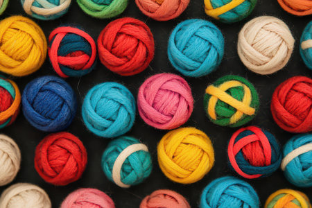 This image showcases a collection of vibrant yarn balls. The composition presents a variety of colors and textures, including oranges, pinks, yellows, and greens. It has a high-angle shot set against a dark background, and it could be used for illustrating craft projects, textile designs, or creative artwork.