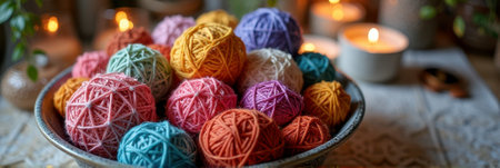 Colorful yarn balls in cozy candlelit setting. That the image is generated using AI.
