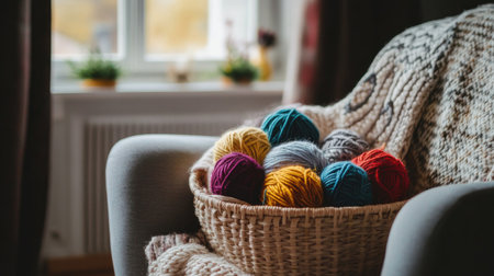 Brighten up your creative space with this cozy interior scene featuring colorful yarn balls in a wicker basket on a comfortable chair, promoting inspiration.