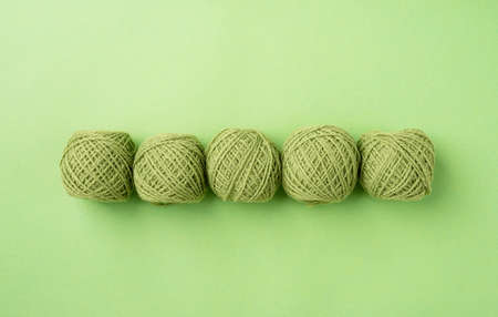 bright green yarn wool in a raw on bright background, top view flat lay