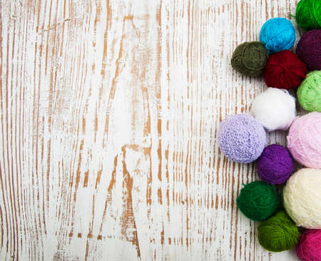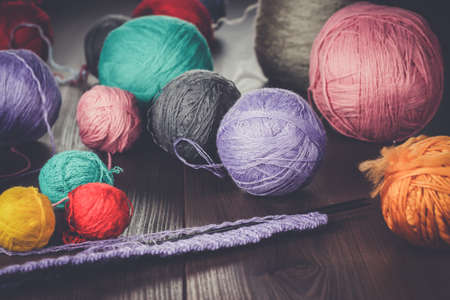 color woolen clews for knitting on a wooden background