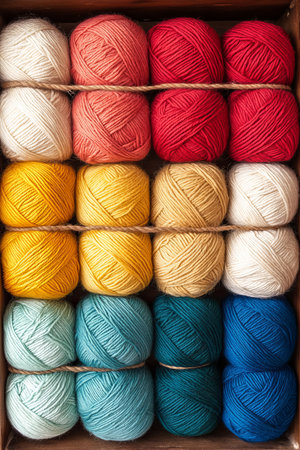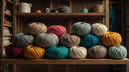 Soft, vibrant yarn balls in a variety of colors are neatly arranged in a crafting space, inviting knitters and artists to create beautiful projects. The warm hues create a cozy atmosphere.