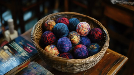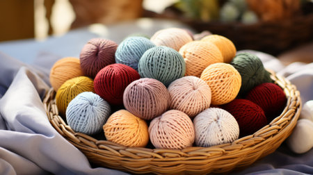 A cozy indoor scene featuring a basket of colorful yarn, showcasing the delicate threads and natural fibers used to create beautiful handmade crafts