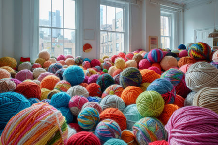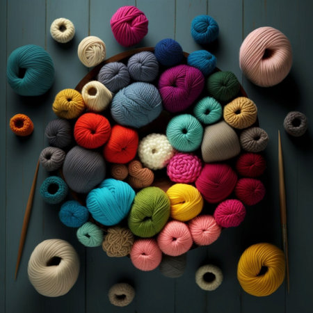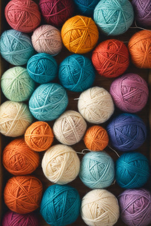 A vibrant collection of yarn balls in diverse colors and textures, arranged artistically, ideal for knitting, crocheting, and creative crafting endeavors, AI generated