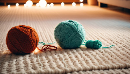 Warm ambiance surrounds three balls of yarn, two large and one small, on a creamy white woven rug, symbolizing home crafts and creativity. AI Generation