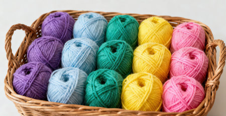 A beautiful collection of vibrant yarn balls is nestled in a woven basket, perfect for inspiring creative projects and enhancing any crafting space with color and texture.