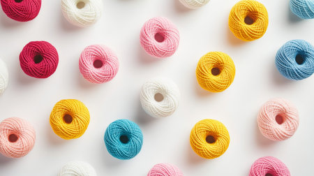 Numerous vibrant yarn rolls are neatly arranged in a grid style on a white background, providing a clean and bright space for creative text or design.