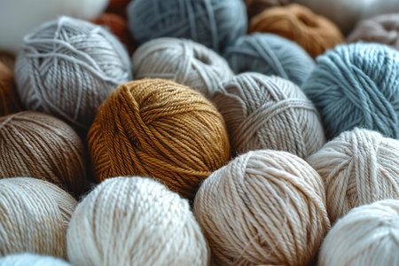 Soft yarn balls in various shades of blue and beige create visually appealing texture. intricate patterns and colors evoke sense of warmth and creativity, perfect for crafting projects