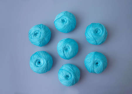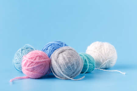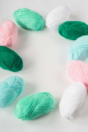Balls of thread for knitting. Knitting threads on a white background. Materials to do the work at home. Multi-colored balls of thread for needlework. Copy space