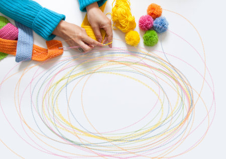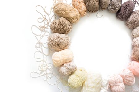 oval acrylic pastel colored wool yarn thread skeins lying on white background, top-down view flat lay still life, horizontal stock photo image template with copy space