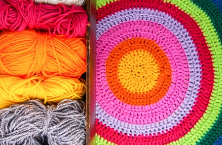Knitted striped mat and colorful skeins of wollen yarn on wooden background.