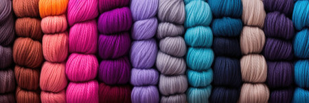 Colorful yarn threads displayed in vibrant array close-up. That the image is generated using AI.