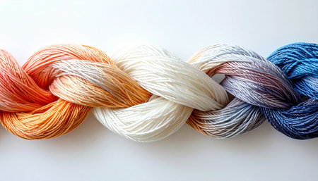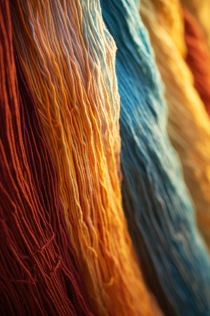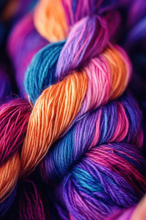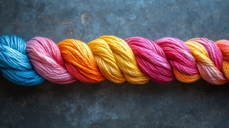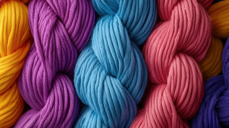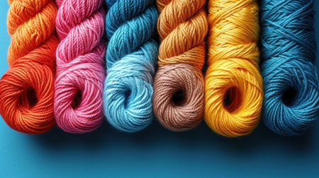 Discover a vibrant arrangement of colorful yarn threads, perfect for crafting, textile art, or design inspirations. Ideal for creative projects and hobbies.