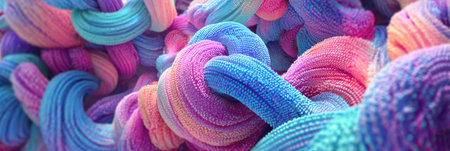 Vivid and colorful strands twist together to form an intricate, abstract design showing a blend of blue, pink, and purple tones.