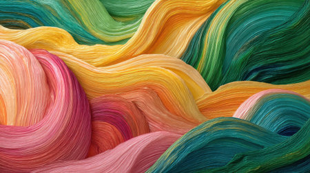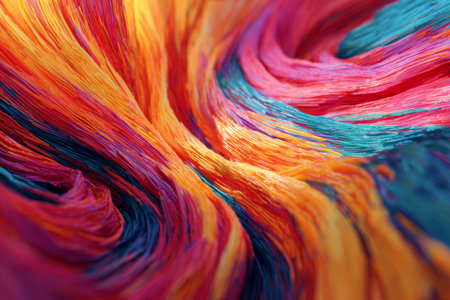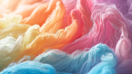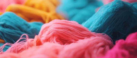 Colorful textile fibers close-up: red, orange, pink, blue, yellow textures. That the image is generated using AI.