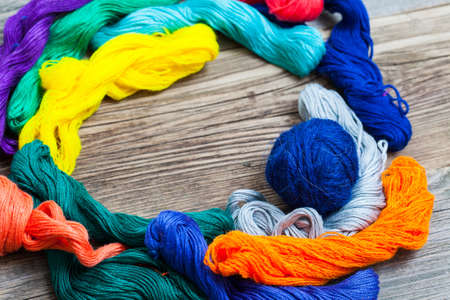 varicolored threads floss for embroidery on old textured boards of tailor’s table. shallow depth of field