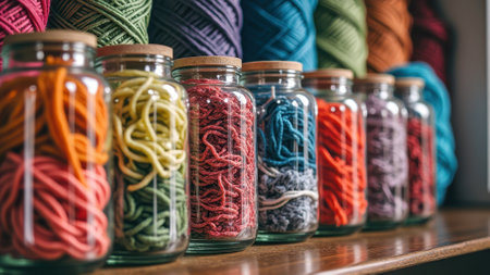 Colorful yarn jars displayed on wooden shelf in sunlit craft room. That the image is generated using AI.