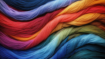Close-up view of vibrant threads in assorted colors for crafting, showcasing detailed texture and design. Perfect for textile projects and creative art.