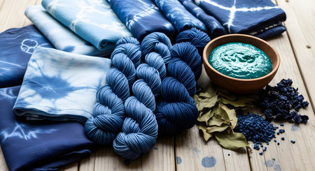 A flat lay arrangement of natural indigo dyeing supplies on a wooden table. The scene includes skeins of blue yarn, shibori tie-dyed fabrics, a bowl of indigo paste, dried pigment, and leaves. This image represents textile crafts, natural dyeing, and DIY hobbies.