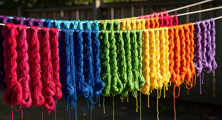 A vibrant array of yarn skeins in a rainbow of colors hangs drying on a clothesline outdoors. The twisted fibers are arranged in a gradient from red to purple, showcasing a textile craft or hand-dyeing process.