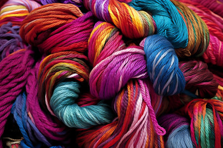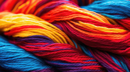 Full frame shot of colorful dyed yarn background. Colorful sewing threads. Thick cotton rope showing detail of threads and fibers. Generative AI illustration for cover, card, design or print.
